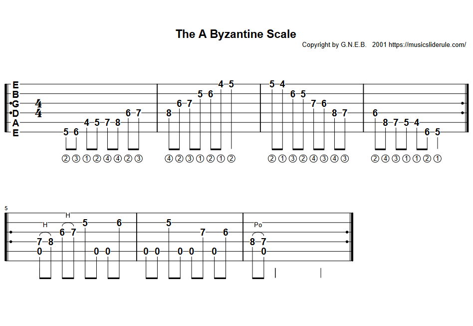 The Byzantine Scale is great for creating an eastern sounding drone type of effect, such as the short example in bars 5-7. The open A string acts as a repetitive drone. Try and experiment for yourself with this scale, it can be a lot of fun.